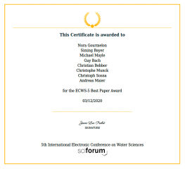 Nora Gourmelon, Siming Bayer, Michael Mayle, Guy Bach, Christian Bebber, Christophe Munck, Christoph Sosna and Andreas Maier received the best paper award at the 5th International Electronic Conference on Water Sciences in the Session “Water Resources Management and the Ecosphere Resilience and Adaptation”. The award was given for their work on “Implications of Experiment Set-Ups for Residential Water End-Use Classification”.