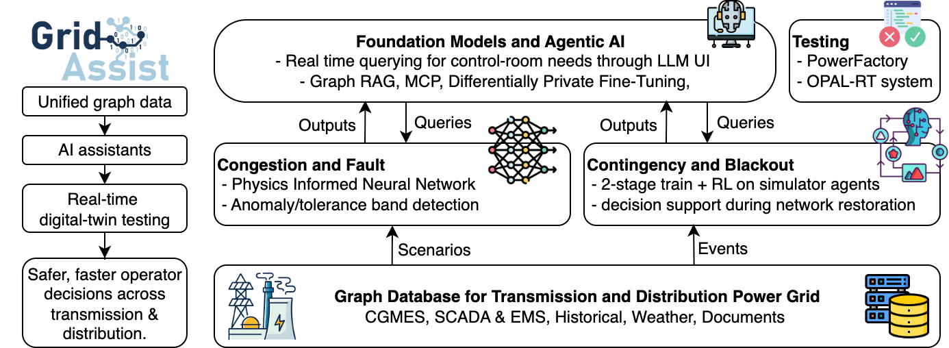 Research Project: GridAssist – AI-based techniques for automated congestion control and fault mangement in power grids, while also buidling a robust knowledge database that integrates and harmonizes heterogeneous power grid data from multiple sources.